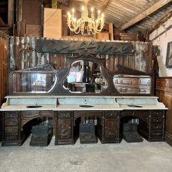 Grand meuble de barbier à 3 vasques de la Maison GELLE FRERES à Paris . Boiserie en bon état , quelques restaurations et taches sur les marbres .