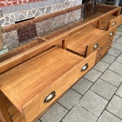 Light oak haberdashery counter with glass front, featuring three pull-out shelves and twelve drawers with shell handles. All drawers open and close smoothly.
