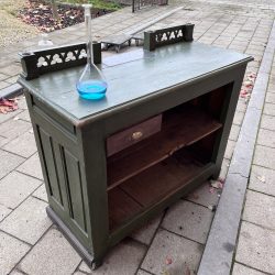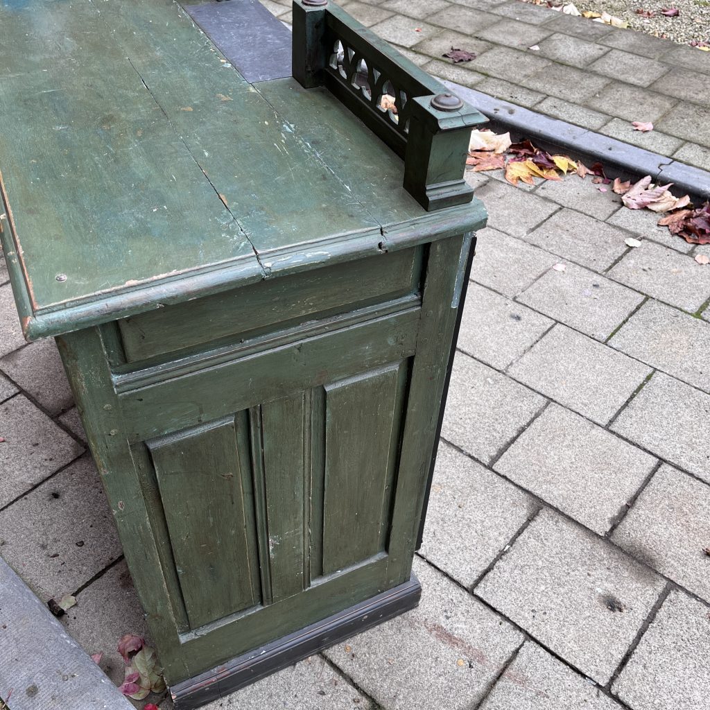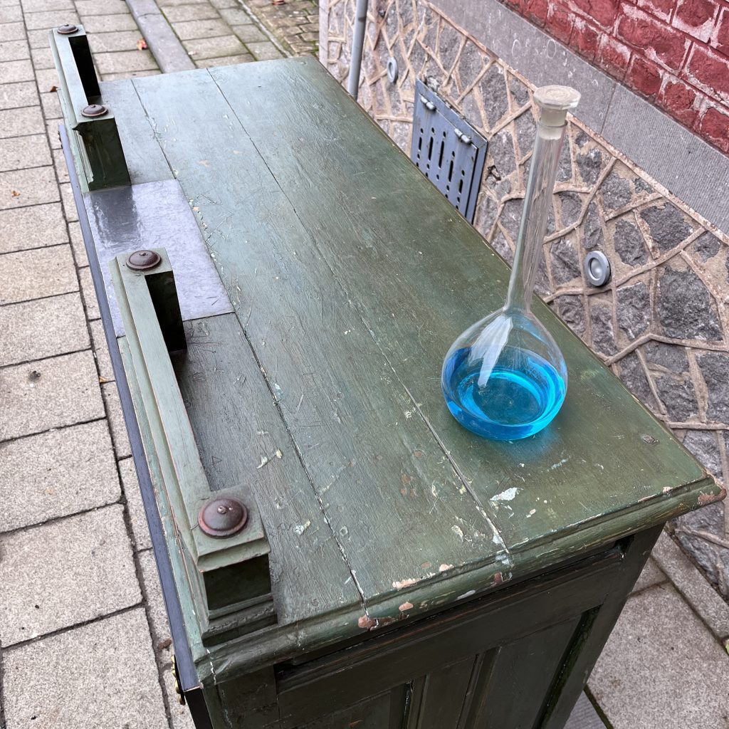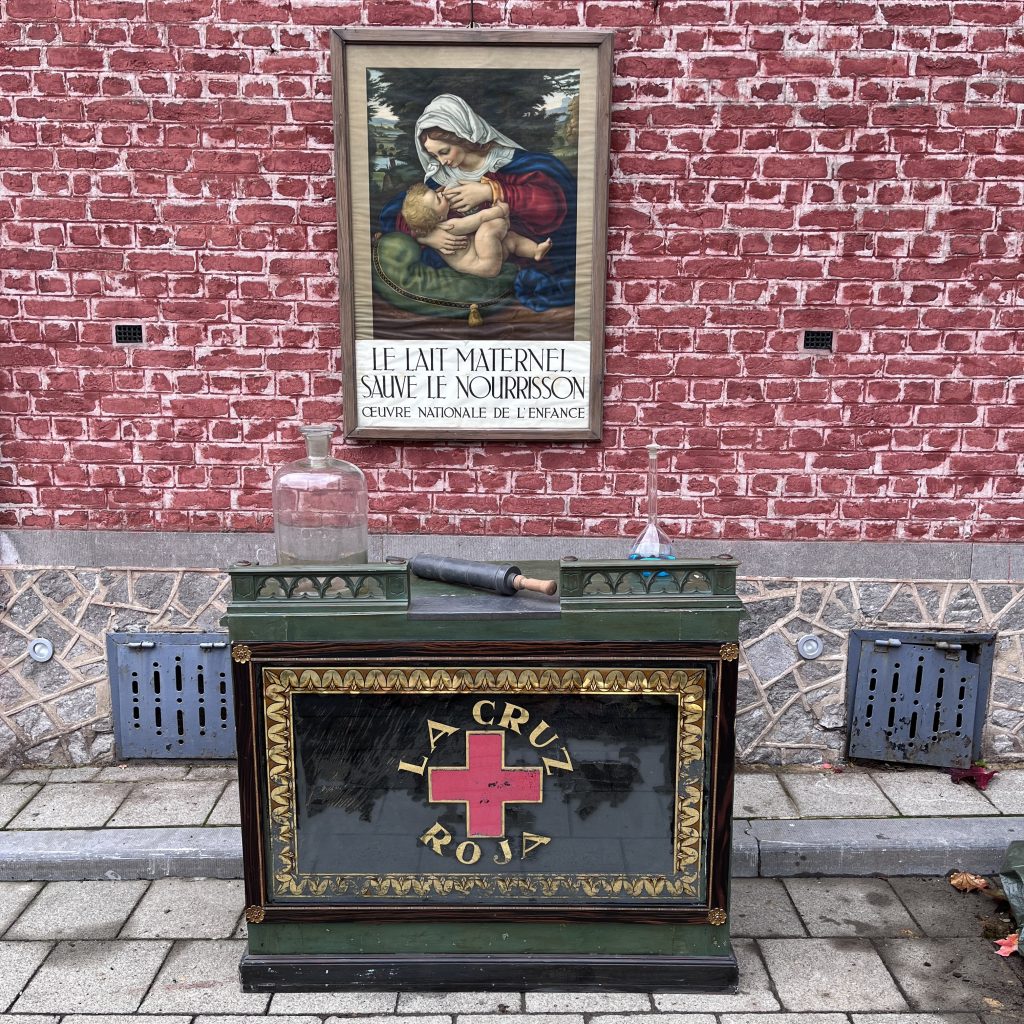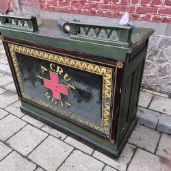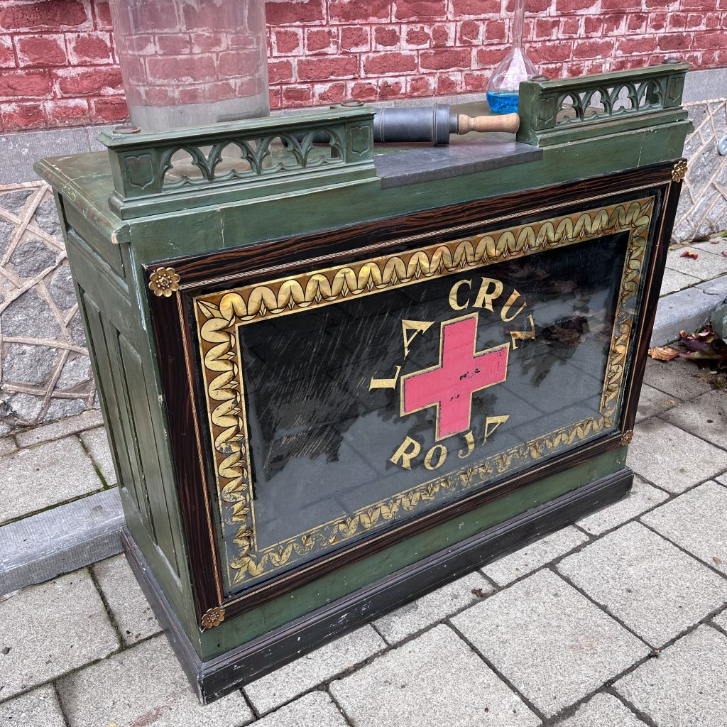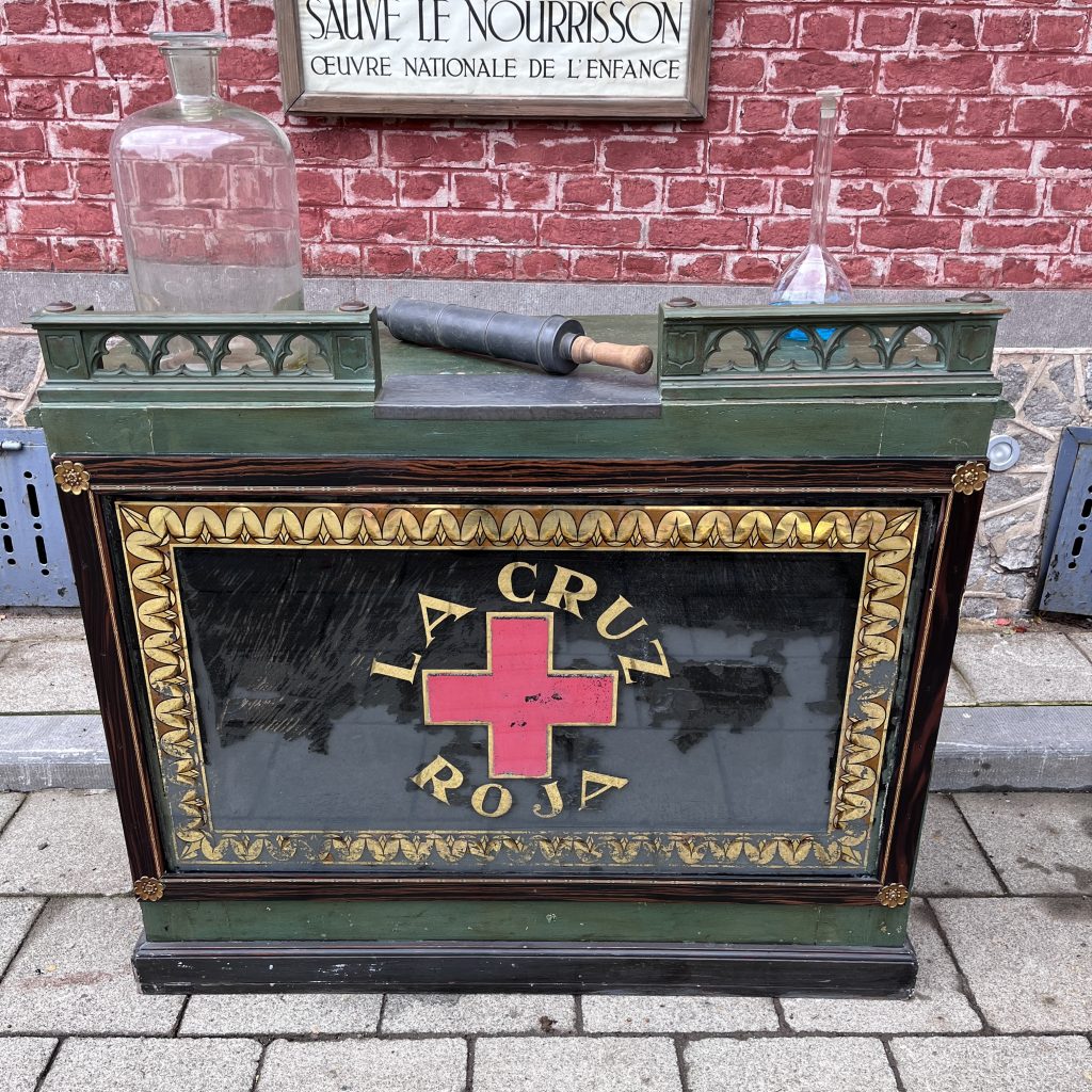 Comptoir de la Croix Rouge espagnole avec patine verte d’origine et façade couverte d’un verre eglomisé décoré du sigle de la Croix Rouge . Spanish Red Cross counter with original green patina and facade covered with eglomized glass decorated with the Red Cross logo. Dimensions: 122 x 52 cm H 96 cm.